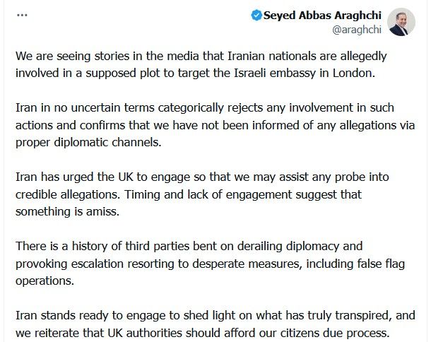 آقای عراقچی نوشت: «جمهوری اسلامی ایران قاطعانه هرگونه دخالت در این اقدامات ادعایی را به طور کامل رد میکند و تأکید دارد که از هیچ اتهامی از طریق مجاری دیپلماتیک رسمی مطلع نشدهایم.»او افزود: «ایران از دولت بریتانیا خواسته است که در این زمینه همکاری لازم را داشته باشد تا بتوانیم در صورت وجود ادعاهای معتبر، در روند تحقیقات مشارکت کنیم. زمانبندی این ماجرا و نبود تعامل رسمی نشاندهنده آن است که موضوعی مشکوک در میان است.»