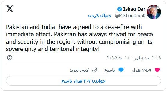 العربیه: اسحاق دار، وزیر خارجه پاکستان، اعلام کرد اسلام آباد و دهلی‌نو به توافقی برای «آتش‌بس فوری» دست یافته‌اند. دونالد ترامپ، رئیس‌جمهوری آمریکا، دقایقی پیش از این توییت وزیر خارجه پاکستان، خبر داده بود که دو کشور هند و پاکستان بر سر یک «آتش‌بس کامل و فوری» توافق کرده‌اند.