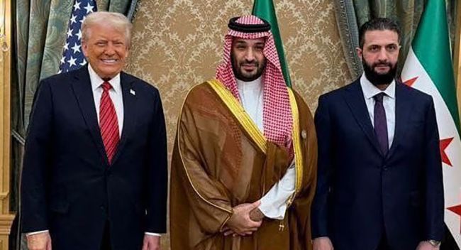 عکس یادگاری احمدالشرع (نفر اول از راست) رهبر جدید سوریه با دونالد ترامپ (نفر اول از چپ) رئیسجمهور آمریکا و محمد بن سلمان، ولیعهد عربستانرئیسجمهور آمریکا روز چهارشنبه ۲۳ اردیبهشت در عربستان سعودی با رهبر جدید سوریه که زمانی از رهبران شورشی بود، دیدار کرد و از احمد الشرع خواست تا به پیمان صلح با اسرائیل بپیوندد.دونالد ترامپ گفت که ارتباط با سوریه به اصرار محمد بن سلمان، ولیعهد سعودی، و رجب طیب اردوغان، رئیسجمهور ترکیه، صورت گرفته است.