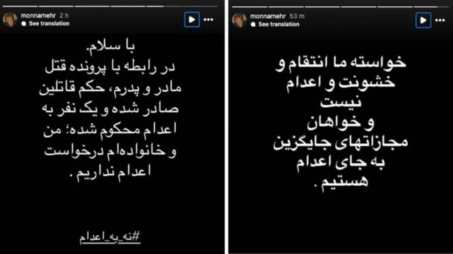 مونا مهرجویی در مراسم تشییع داریوش مهرجویی و وحیده محمدیفربی بی سی: مونا مهرجویی، دختر داریوش مهرجویی کارگردان صاحبنام سینمای ایران، در واکنش به خبر تایید حکم متهمان پرونده قتل پدر و مادرش در اینستاگرام نوشت که او و خانوادهاش درخواست اعدام ندارند و خواستار مجازات جایگزین شده است.خانم مهرجویی در حساب اینستاگرام خود با هشتگ «نه به اعدام» نوشت: «خواسته ما انتقام و خشونت و اعدام نیست و خواهان مجازاتهای جایگزین به جای اعدام هستیم.»