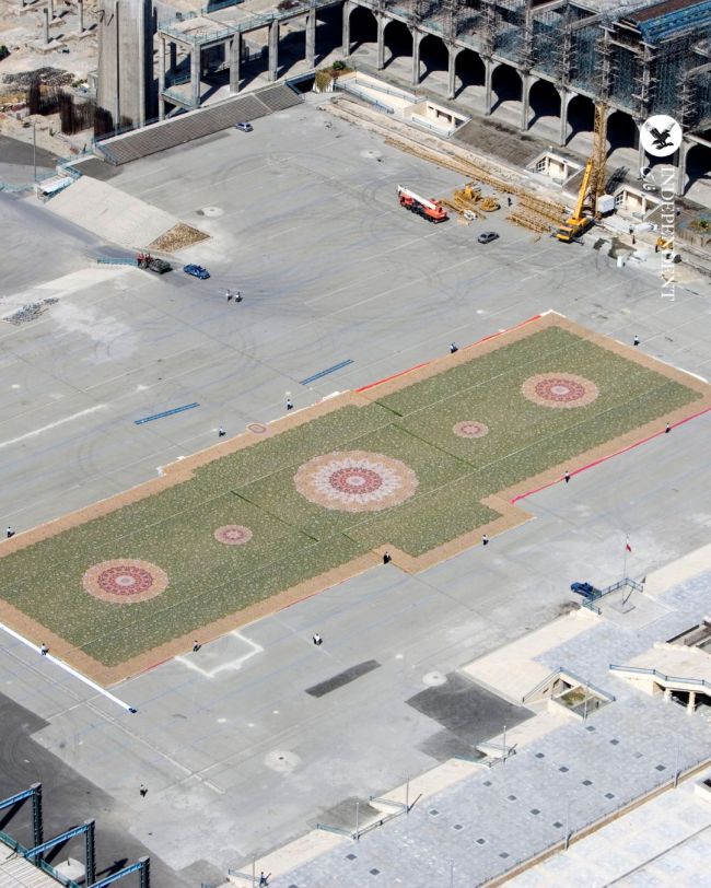 این فرش با دو هواپیمای باربری به ابوظبی منتقل و با طی کردن مراحل برش و پرداخت نهایی در شبستان، پهن شد.