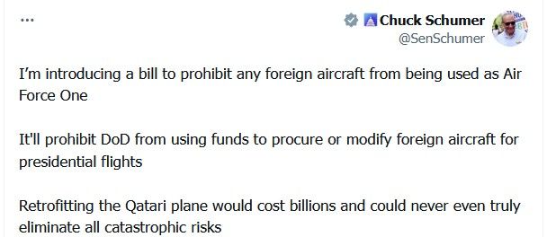 همزمان، چاک شومر، سناتور دموکرات نیویورک و رهبر اقلیت دموکرات در سنای آمریکا در پستی در شبکه اجتماعی ایکس خبر داد که در صدد ارائه طرح قانونی جدیدی است که استفاده از هواپیماهای خارجی برای «ایر فورس وان» را ممنوع میکند.