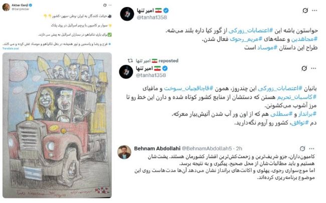 کارزار مشترک علیه نتانیاهو، براندازها، پهلوی و اعتصاب کامیونداراناین کارزار صرفاً یک روایتسازی یا جنگ روانی از سوی چند فعال سیاسی و بسیجی در بستر فضای مجازی نیست، بلکه به نظر میرسد در وزارت خارجه جمهوری اسلامی نیز در مورد توطئههای احتمالی اسرائیل برای خرابکاری در زیرساختها و به راه انداختن آشوب مدام صحبت میشود.