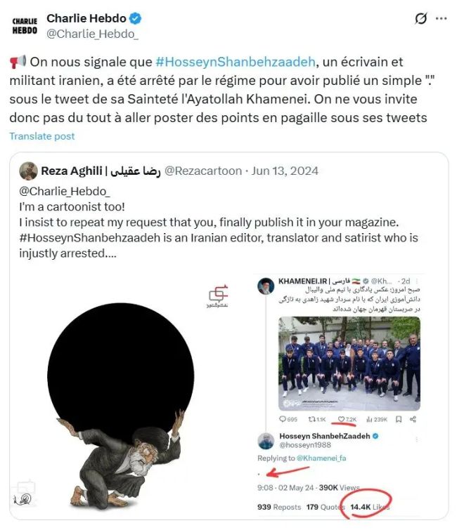 هفته نامه فکاهی شارلی ابدو در توییتی ضمن بازنشر کارتونی از رضا عقیلی درباره حسین شنبهزاده، با ادبیات طعنهآمیز از کاربران خواست زیر توییتهای آیتالله خامنهای را پر از نقطه کنند.