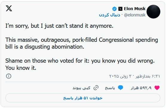 ایلان ماسک در چند پست دیگر نیز این لایحه را باعث افزایش کسری بودجه عظیم فعلی خواند و نوشت: «کنگره در حال ورشکست کردن آمریکاست».