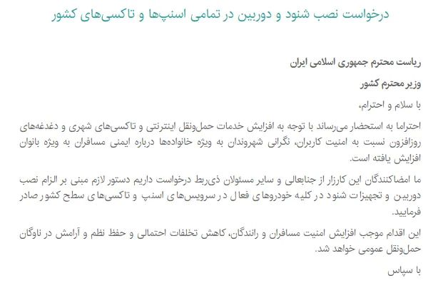امضا کنندگان از وزارت کشور خواستهاند دستوراتی برای اجباری شدن نصب «شنود» در تاکسیهای اینترنتی صادر کند. تاکنون حدود ۳۲ هزار نفر از این کارزار حمایت کردند.