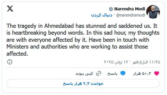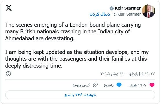 کییر استارمر، نخستوزیر بریتانیا، نیز روز پنجشنبه گفت تصاویر سقوط هواپیمای ایر ایندیا، «فاجعهبار» است و او در جریان تحولات قرار گرفته است.