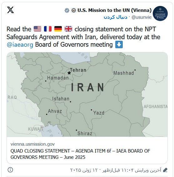 نماینده آمریکا با اعلام این‌که به ایران فرصت نهایی برای همکاری با آژانس داده شده است از این‌که ایران « به جای همکاری کامل مورد نیاز، به تهدید به تشدید و تقابل ادامه داده است» ابراز تاسف کرد.