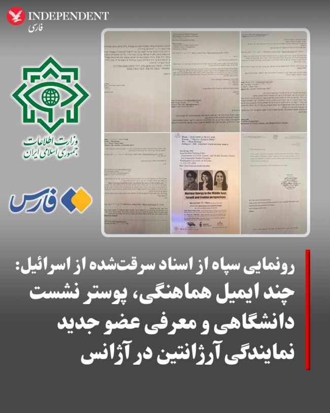 ایندیپندنت فارسی: خبرگزاری فارس وابسته به سپاه پاسداران، مجموعهای از تصاویر از یک سری مکاتبه عادی و غیرمحرمانه را با عنوان «اسناد ضربه اطلاعاتی به رژیم صهیونیستی» منتشر کرد.در این مجموعه تصاویر چند ایمیل هماهنگی میان دو نفر برای برگزاری یک نشست دانشگاهی در مورد برنامه هستهای ایران و اسرائیل وجود دارد. این دو نفر در مورد اینکه سخنرانان این نشست و نحوه برگزاری آن به چه شکلی باشد با هم مشورت کردهاند.