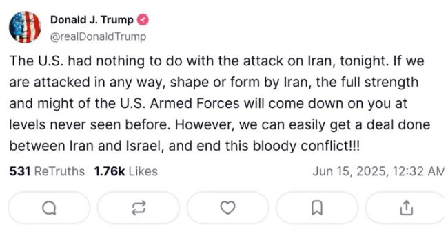 هشدار ترامپ به جمهوری اسلامی: اگر به ما حمله کنید پاسخ بیسابقه خواهد بوددونالد ترامپ، رییس جمهوری آمریکا در شبکه اجتماعی تروث نوشت: ایالات متحده هیچ نقشی در حمله امشب به ایران نداشت. اما اگر ایران به هر شکل و شیوهای به ما حمله کند، تمامی قدرت و توان نیروهای مسلح آمریکا با شدت و سطحی بیسابقه بر شما فرود خواهد آمد. بااینحال، ما میتوانیم بهسادگی توافقی میان ایران و اسرائیل به دست آوریم و به این درگیری خونین پایان دهیم!