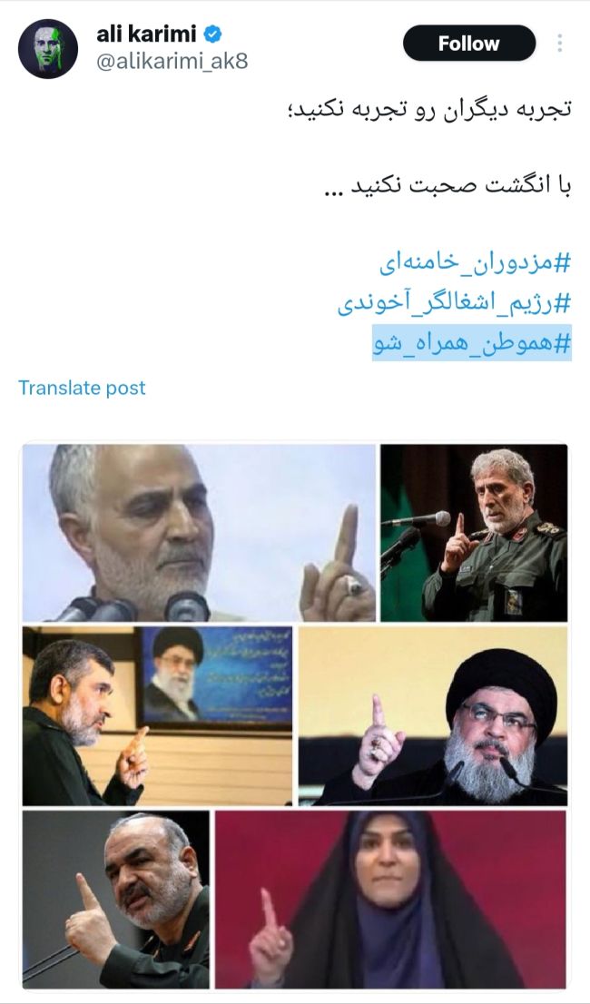 مردم هوشیار باشید که ملاها در حال التماس کردن به همه کشورها هستند که یک جوری بتوانند بقا خودشان را حفظ کنند. جنگ باید متوقف شود، درست، کسی ویرانی وطنش را نمی تواند ببیند ولی الان که اسرائیل اکثر زیر بناهای تسلیحاتی و موشکی و اتمی رژیم را زده و مطمئن است که رژیم اشغالگر ایران تا سالیان سال طول میکشه که بخواهد این ویرانی ها را بازسازی کند الان دول غربی به خاطر حفظ بقا و قدرت ملاها در ایران دادند روی پیشنهاد آخوندها فکر می کنند و احتمالا باز سر میز مذاکره می نشینند. چرا؟ چون دول غربی و آمریکا و حتی اسرائیل خواهان تغییر رژیم اشغالگر ایران نیستند آنها فقط می خواستند مطمئن بشوند که حالا حالاها دیگر از طرف رژیم تهدید نمی شوند و حیثیت این رژیم را در جهان به باد دادند ولی اگر مذاکره ایی بشود آخوندها برای بقا خودشان به هر ذلتی تن می دهند تا سر قدرت بمانند و آنوقت ما می مانیم و کشوری ویران و باز آخوندهای تا دندان مسلح برای مردم بی دفاع ایران. حرف من این است که به هیچ دولتی اعتماد نکنید و این خود ما هستیم که تا دیر نشده باید از شر این رژیم اشغالگر خلاص شویم. این حرف یادتون باشه.