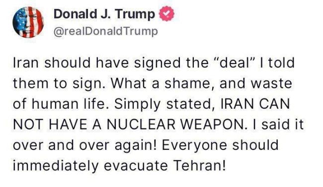 دونالد ترامپ، رییسجمهوری آمریکا، با اشاره به اینکه جمهوری اسلامی «باید توافقی را که من گفته بودم امضا کند، امضا میکرد،» گفت: «همه باید فورا تهران را تخلیه کنند.»ترامپ در پستی در شبکه اجتماعی تروث سوشال جان باختن انسانها در نتیجه عدم امضای توافق را «شرمآور» خواند و افزود ایران نباید به سلاح هستهای دست یابد.
