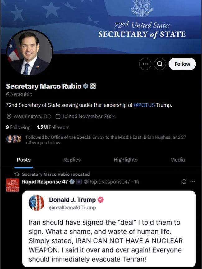 مارکو روبیو، وزیر امور خارجه آمریکا، پست دونالد ترامپ، رییس جمهوری آمریکا مبنی بر تخلیه فوری تهران از سوی شهروندان را در حساب خود در شبکه اجتماعی ایکس بازنشر کرد.