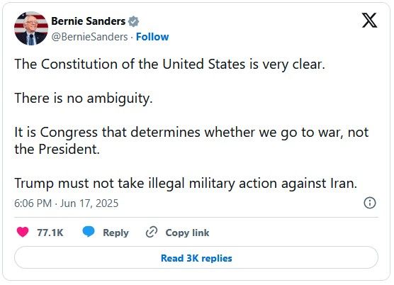 برنی سندرز، سناتور دموکرات ایالت ورمانتبرنی سندرز، سناتور دموکرات ایالت ورمانت، در واکنش به احتمال اقدام نظامی یکجانبه از سوی رئیسجمهور ایالات متحده علیه ایران هشدار داد و تأکید کرد که بر اساس قانون اساسی آمریکا، تصمیمگیری درباره ورود به جنگ صرفاً در اختیار کنگره است.سندرز روز سهشنبه در پیامی در شبکه اجتماعی ایکس نوشت: «قانون اساسی ایالات متحده کاملاً روشن است. هیچ ابهامی وجود ندارد. این کنگره است که تصمیم میگیرد وارد جنگ شویم، نه رئیسجمهور.»