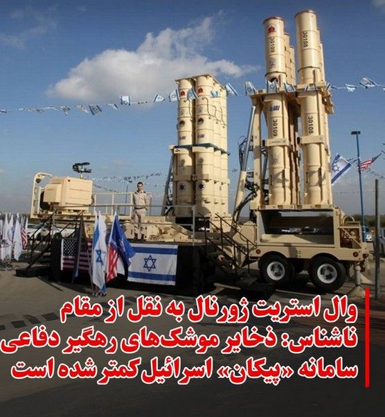 وال استریت ژورنال به نقل از یک مقام ناشناس : ذخایر موشکهای رهگیر دفاعی سامانه «پیکان» (Arrow) اسرائیل رو به کاهش است.