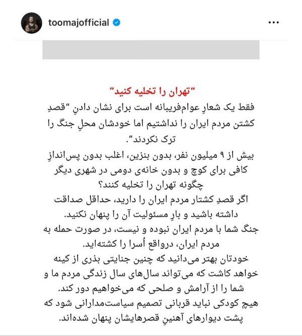 واکنش تند توماج صالحی به تخلیه تهران توسط ترامپ