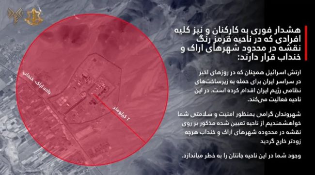 ارتش اسرائیل هشدار تخلیه برای ساکنان محدوده ۲ کیلومتری از تاسیسات آب سنگین اراک صادر کرد