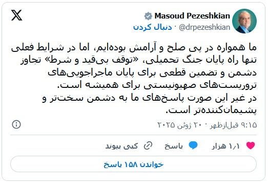 مسعود پزشکیان، رئیسجهوری ایران روز جمعه تنها راه پایان جنگ با اسرائیل را «توقف بی قید و شرط» حملات این کشور دانست.
