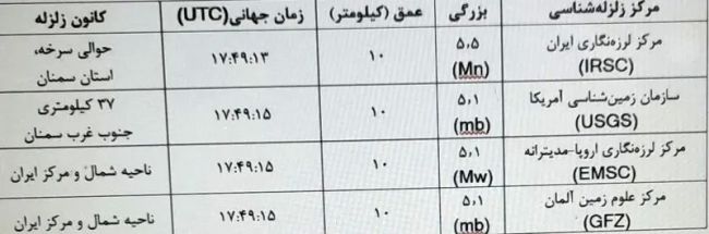 شب گذشته ۳۰ خرداد زمینلرزهای به بزرگی ۵.۵ ریشتر (و بر اساس برخی گزارشها ۵٫۱) حوالی شهر سرخه را در استان سمنان لرزاند. این زلزله در بخشهایی از استانهای تهران، قم و مازندران نیز احساس شد. به گزارش خبرآنلاین، مقایسه گزارش ثبتشده در مرکز لرزهشناسی کشوری با چند مرکز معتبر لرزهشناسی جهانی که در جدول زیر آمده، از سازگاری دادهها حکایت دارد.