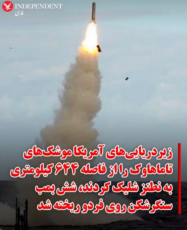 زیردریایی‌های آمریکا موشک‌های تاماهوک را از فاصله 644 کیلومتری به نطنز شلیک کردند، 6 بمب سنگرشکن روی فردو ریخته شدشان هنیتی، خبرنگار فاکس نیوز، می‌گوید که به‌تازگی با دونالد ترامپ، رئیس‌جمهور آمریکا، تلفنی صحبت کرده و ترامپ به او گفته که ایالات متحده برای هدف قرار دادن سایت هسته‌ای زیرزمینی فردو در ایران، از شش بمب سنگرشکن استفاده کرده است.
