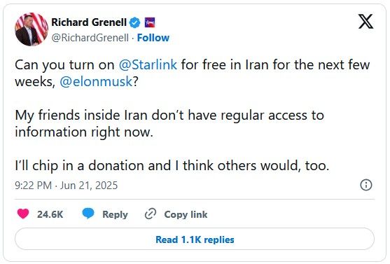 ریچارد گرنل، فرستاده ویژه رئیسجمهوری ایالات متحده در امور ماموریتهای خاص از ایلان ماسک خواست، اینترنت ماهوارهای استارلینک را برای ایران به صورت رایگان فعال کند.