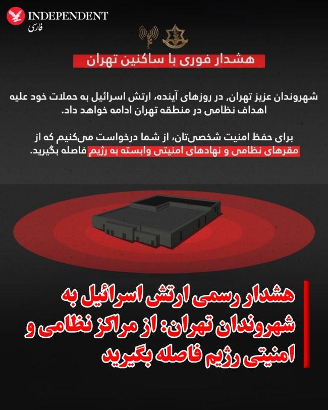 هشدار فوری ارتش اسرائیل به ساکنان تهران: از مقرهای نظامی و نهادهای امنیتی وابسته به رژیم فاصله بگیرید