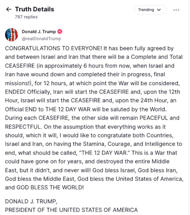 دونالد ترامپ با انتشار مطلبی در شبکه اجتماعی تروت سوشال، از توافق آتشبس میان اسرائیل و جمهوری اسلامی داد.او نوشت: «تبریک به همه! توافق کامل و نهایی میان اسرائیل و ایران حاصل شده است: آتشبس کامل و سراسری، حدود شش ساعت دیگر — پس از پایان آخرین مأموریتهای در حال اجرای دو طرف — آغاز خواهد شد و به مدت ۱۲ ساعت ادامه مییابد. پس از آن، جنگ بهطور رسمی پایانیافته تلقی خواهد شد.»