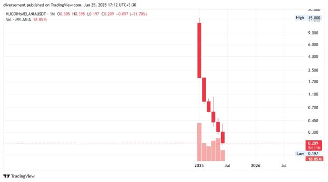 تنها در دو ماه گذشته، قیمت توکن ملانیا بیش از ۵۹ درصد از ارزش خود را از دست داده است. همانطور که در نمودار ماهانه ارز ملانیا مشاهده میکنید، توکنی که در روزهای ابتدایی عرضهاش تا محدوده ۱۵ دلار نیز معامله میشد، حالا به سقوط ۹۹ درصدی، به زیر یک دلار (۲۰ سنت) رسیده است؛ سطحی که پایینترین رکورد قیمتی آن محسوب میشود.