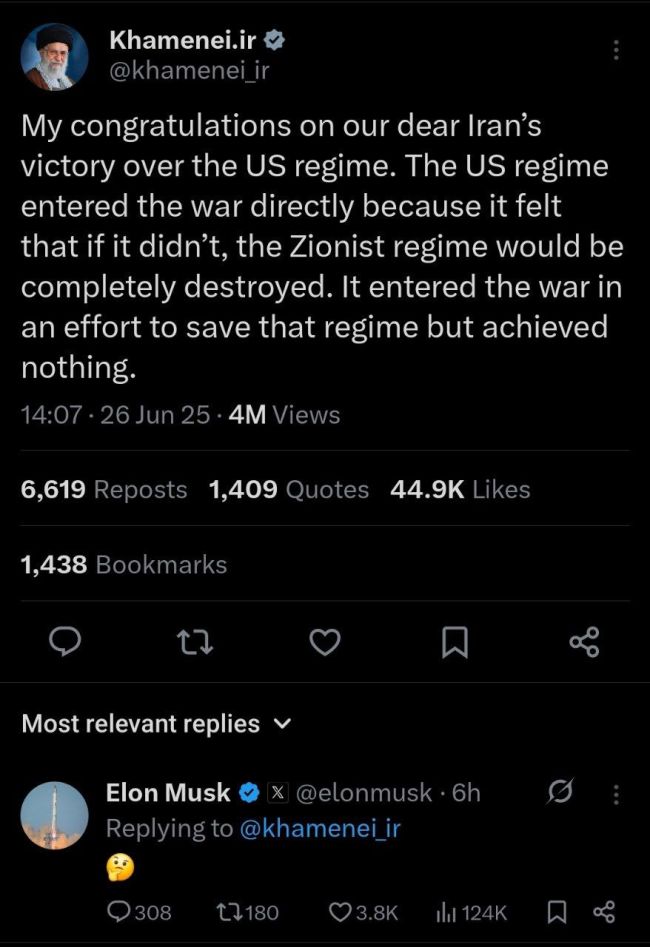 کامنت ایلان ماسک زیر توییت على خامنه ای که گفته بود "ایران بر آمریکا هم پیروز شد