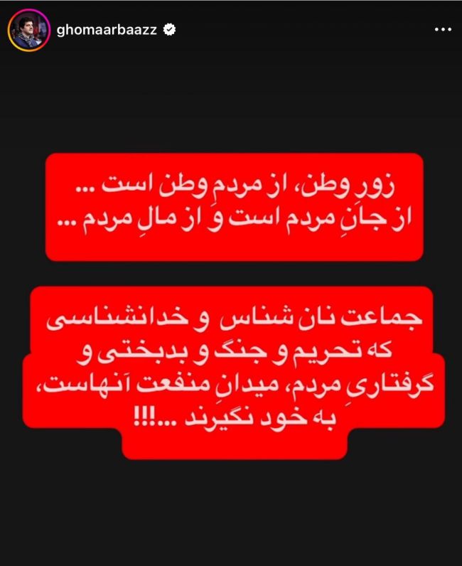 کهنه سرباز - بروکسل، بلژیک. اینروزها ها فقط باید خندید به حال وطن فروش خائن داخلی و خارجی و دشمنانی که فکر کردند مردم غیور میهن عزیزمان زانو می زنند اتحاد ، دفاع و جواب دندان شکن ایران عزیز به ابر قدرت ها بی نظیر بود و ما تا کنون این آزمایش را نداشتیم اطاق اطلاعاتی کشورهای قدرتمند و اسرائیل الان دارند محاسبه می کنند چه جوری خوردند و مجبور شدند به دستور ترامپ قنبل قهرمانانه کنند ، قرار بود ما در مذاکرات قنبل کنیم ولی کاری کردیم که قنبل کردند و روغن هاش هم با موشک هتی خیبر شکن فرستادیم براشون که زیاد دردشان نگیره . سرافراز ایران عزیز و ننگ ماند و دشمنان وطن