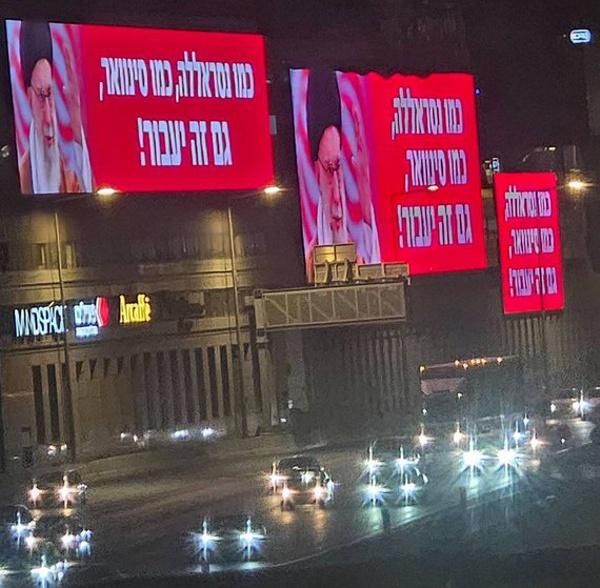اسرائیل در پاسخ به نصب روز شمار جدید «نابودی» اسرائیل در میدان فلسطین تهران بیلبوردی از تصویر خامنهای را در تلآویو نصب کرد که بر روی آن نوشته شده«درست مانند نصرالله و سینوار، خامنهای هم خواهد رفت»