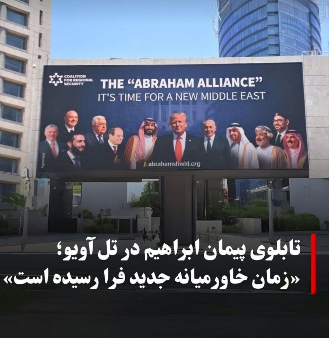 چند روز پیش نیز اسرائیل بیلبورد بزرگی با عنوان« زمان خاورمیانه جدید فرا رسیده است» در تلآویو نصب کردبیلبورد جنجالی در تلآویو؛ ترامپ، نتانیاهو و سران ۸ کشور عربی : محمد بنسلمان، السیسی، محمود عباس، جوزف عون، عبدالله دوم، احمد الشرع، بنزاید، سلطان عمان، پادشاهان بحرین و مراکش قرار دارند.