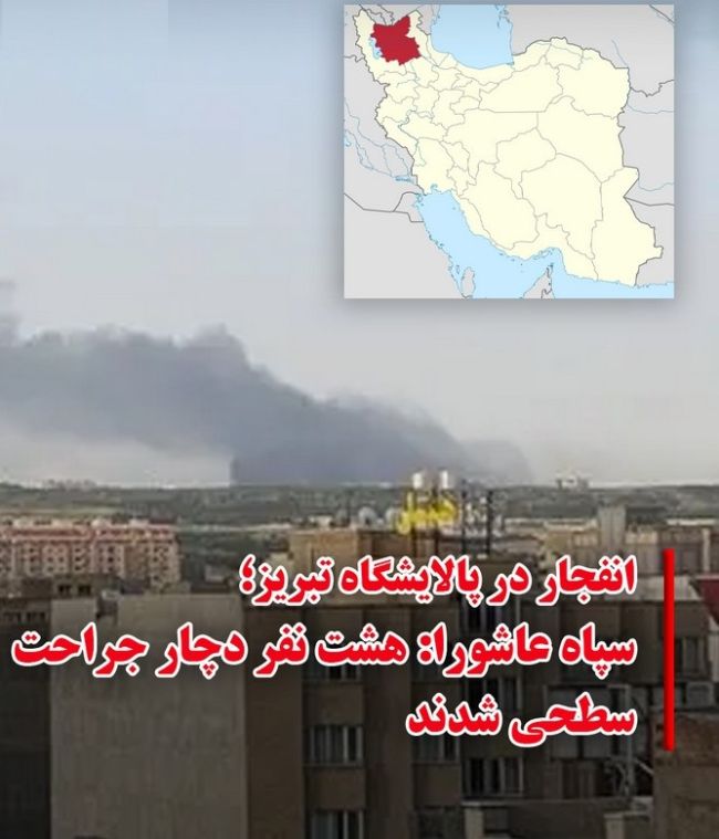 انفجار در پالایشگاه تبریز؛ سپاه عاشورا: هشت نفر دچار جراحت سطحی شدندروابط عمومی «سپاه عاشورا» اعلام کرد در پی حادثه مربوط به «تعویض مخزن ازت در پالایشگاه تبریز»، هشت نفر مجروح شدند. در همین حال، رسانه‌های داخلی گزارش دادند که انفجار این مخزن در یکی از واحدهای در حال راه‌اندازی پالایشگاه، صدای مهیبی ایجاد کرده و دود ناشی از آن نیز در اطراف پالایشگاه مشاهده شده است.