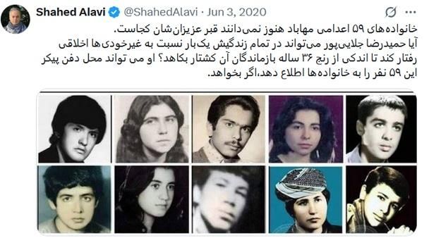 حمیدرضا جلاییپور، نماد خوبی از جمهوری اسلامی است: تبهکار، دروغگو، بیپرنسیب و فاقد اخلاق. او در تمام این سالها میتوانست با اطلاعدادن محل دفن پیکر این ۵۹ اعدامی به خانوادههای آنان، اندکی از رنج ۴۲ ساله بازماندگان آن کشتار بکاهد. این کاری است که او نکرده است و بعید است در آینده هم انجام دهد، چون برخی رفتارها به درجهای از انسانیت نیاز دارد که کارگزاران جمهوریاسلامی از صدر تا ذیل فاقد آن هستند ...
