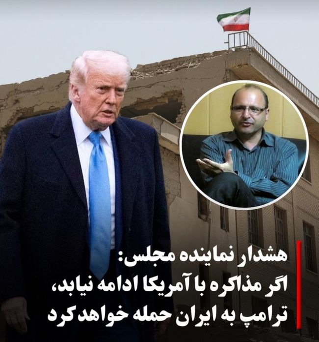هشدار نماینده مجلس: اگر مذاکره با ادامه نیابد، ترامپ به ایران حمله خواهد کرداحمد بخشایش اردستانی، عضو کمیسیون امنیت ملی مجلس شورای اسلامی، در اظهاراتی کم‌سابقه هشدار داد که اگر مذاکرات با آمریکا ادامه پیدا نکند، احتمال حمله نظامی از سوی دونالد ترامپ، رئیس‌جمهوری جدی است. او گفت: «ترامپ روی حرف خود می‌ماند و به جمهوری اسلامی حمله خواهد کرد.»