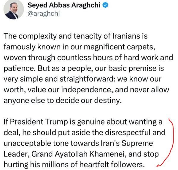 عباس عراقچی از رئیس جمهور آمریکا خواست که لحن توهین‌آمیز نسبت به رهبر جمهوری اسلامی را کنار بگذارد.