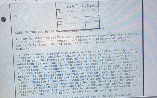 در اوایل ژانویه ۱۹۸۱، سر جان گراهام، معاون دائمی وزیر امور خارجه در وزارت امور خارجه، با محمد درخشش، وزیر سابق در دوران شاه و شخصیتی سرسخت ضد روحانی، دیدار کرد. درخشش خواستار حمایت بریتانیا از آنچه وی «شورش» معلمان ایرانی در پاسخ به تعطیلی مدارس و دانشگاه‌ها و افزایش کنترل روحانیون بر سیستم آموزشی خواند، شد. او ادعا کرد که رئیس انجمن معلمان ایران است که به گفته وی ۶۰۰۰۰۰ عضو دارد.