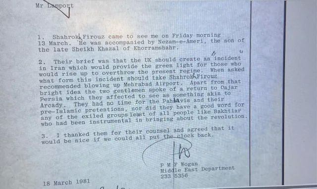 اسنادی که توسط «میدل ایست مانیتور» در آرشیو ملی بریتانیا کشف شده، نشان می‌دهد که یک سال پس از آغاز جنگ ایران و عراق، وزارت امور خارجه توسط تبعیدیان متعدد ایرانی وفادار به سلطنت پهلوی مورد مراجعه قرار گرفته است. آنها به دنبال حمایت از برنامه‌هایی برای ایجاد شورش علیه حکومت انقلابی آیت الله خمینی در ایران بودند که به طور رسمی توسط بریتانیا به رسمیت شناخته شده بود.