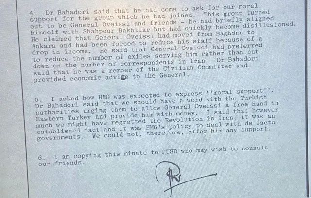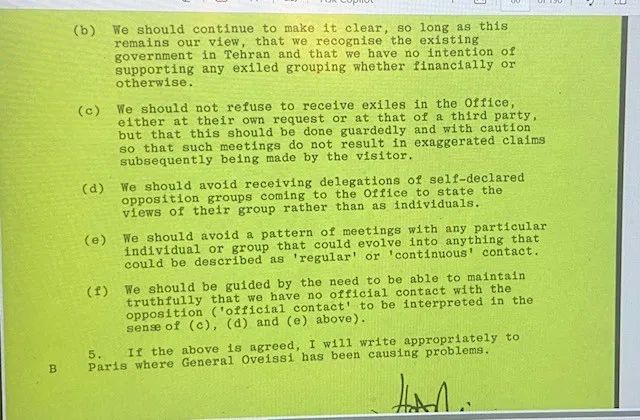 در آن زمان، وزارت امور خارجه تصمیم گرفت که سیاست بریتانیا در مورد تماس با مخالفان ایرانی را پس از مشاهده افزایش تعداد و فعالیت تبعیدیان ایرانی، بازنگری کند. بریتانیا، همانطور که ا. س. میرز، رئیس اداره خاورمیانه در وزارت امور خارجه، گفت، می‌خواست «از افزودن به سوءظن اجتناب ناپذیر دولت انقلابی ایران مبنی بر اینکه ما در حال توطئه برای سرنگونی آنها هستیم، اجتناب کند.» بریتانیایی‌ها همچنین مشتاق بودند که «در موقعیتی باقی بمانند که بتوانند علناً و با حقیقت و قاطعیت انکار کنند که با گروه‌های مخالف گفتگو داشته‌اند.»