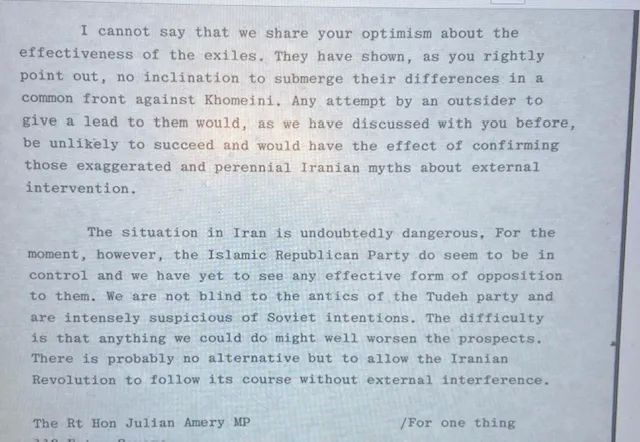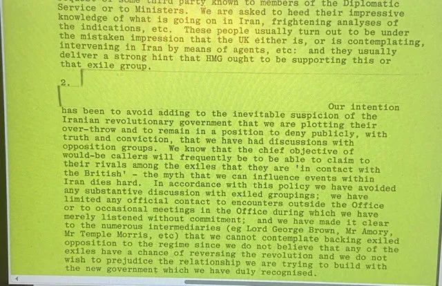 بررسی سیاست بریتانیا که توسط وزارت امور خارجه و مشترک المنافع (FCO) در آستانه سقوط شاه انجام شده بود، توصیه کرده بود که تماس با گروه‌های مخالف داخلی و تبعیدی حفظ شود. در نتیجه، وزارت امور خارجه کانال‌های غیررسمی را باز نگه داشت، اگرچه رسماً و علناً بی‌طرف ماند.
