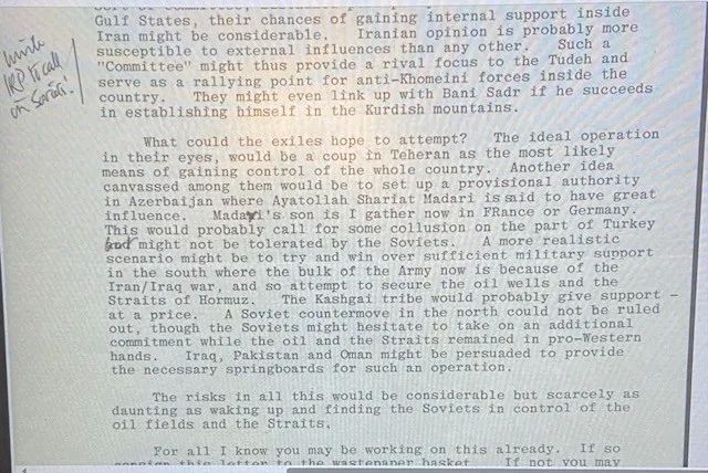 در اواخر ژانویه، اردشیر زاهدی، وزیر امور خارجه سابق ایران، پیامی را از طریق دوستش جولیان امیری، نماینده محافظه‌کار حامی مداخله‌گر و سیاستمدار مشهور صهیونیست، به وزارت امور خارجه ارسال کرد. زاهدی ادعا کرد که رژیم خمینی «نزدیک به مرحله پایانی خود» است. او هشدار داد که رژیم بعدی می‌تواند یا طرفدار غرب باشد یا طرفدار شوروی، و استدلال کرد که هر طرح مخالف که آشکارا توسط ایالات متحده و بریتانیا حمایت شود، «حمایت مهاجرت (ایرانیان) را جلب خواهد کرد.»