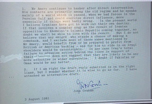 در همین حال، سر گراهام از «میل به مداخله مستقیم» امیری در ایران انتقاد کرد. در پاسخ خود، او تأکید کرد که در دنیای کنونی، ایرانی‌ها «باید سرنوشت خود را بسازند.» او گفت: «اگر این امر مستلزم یک ضد کودتا در نتیجه همبستگی مخالفان ایرانی با جمهوری اسلامی خمینی باشد، بدون شک ما می‌توانیم با نتیجه آن کنار بیاییم.» با این حال، گراهام تأکید کرد که او «باور نداشت که هیچ تبعیدی که شانسی برای بازگشت دارد، از حمایت بریتانیا یا آمریکا بهره‌مند شود یا آماده بهره‌مندی باشد.»