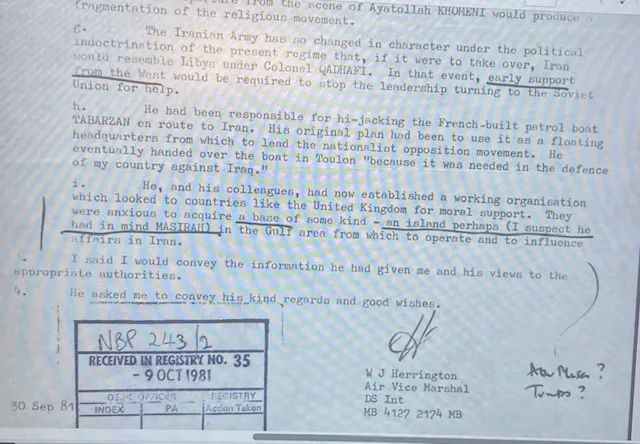 اسناد محرمانه دولت بریتانیا نشان می‌دهد که بریتانیا در سال ۱۹۸۱ چندین درخواست ارائه شده توسط افراد و گروه‌های مخالف ایرانی در تبعید را برای حمایت بریتانیا از تلاش‌های نظامی و سیاسی برای سرنگونی حکومت انقلابی جمهوری اسلامی رد کرده است.