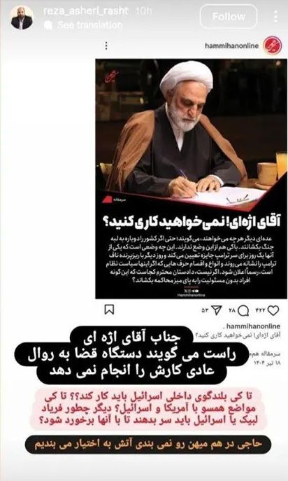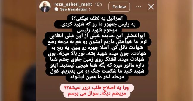 عضو شورای شهر رشت، با انتشار استوریهایی جنجالی در اینستاگرام، از اسرائیل خواست مسعود پزشکیان، رئیس دولت جمهوری اسلامی، را ترور کندایران وایر: «رضا عاشری»، عضو شورای شهر رشت، با انتشار استوریهایی جنجالی در اینستاگرام، از اسراییل خواست «مسعود پزشکیان»، رییس دولت جمهوری اسلامی را ترور کند. او در یکی از این استوریها نوشت: «اسراییل ابراهیم رئیسی را هدف قرار داد؛ اگر پزشکیان را هم بکشد، ما شکست جنگ را میپذیریم.»