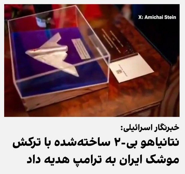 آمیخای استاین، خبرنگار شبکه آی۲۴ در شبکه ایکس نوشت بنیامین نتانیاهو، نخستوزیر اسرائیل، در سفر به آمریکا و دیدار با دونالد ترامپ یک یک مزوزا (قاب دعا) به رییسجمهور ایالات متحده هدیه داده که از ترکش یک موشک ایرانی ساخته شده و به شکل بمبافکن بی-۲ طراحی شده است.موضوع مقابله با جمهوری اسلامی از مهمترین موضوعات گفتوگوهای رهبران اسرائیل و آمریکا بوده است. بمبافکن بی-۲ از تسلیحات استفاده شده آمریکا برای حمله اخیر به تاسیسات اتمی جمهوری اسلامی بود.