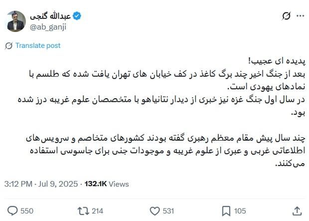 عبدالله گنجی، مشاور شهردار تهران و مدیرمسئول پیشین روزنامه همشهری، در پیامی در حساب کاربری خود در ایکس نوشت که پس از «جنگ ۱۲ روزه» میان اسرائیل و جمهوری اسلامی، «چند برگ کاغذ دارای طلسم با نمادهای یهودی» در سطح خیابان‌های تهران پیدا شده است.