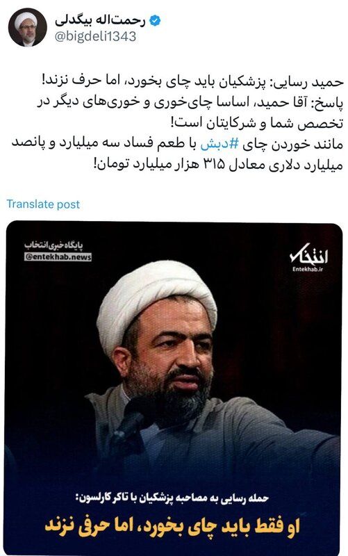 حمید رسایی: پزشکیان باید چای بخورد، اما حرف نزند!/ پاسخ رحمتالله بیگدلی به او