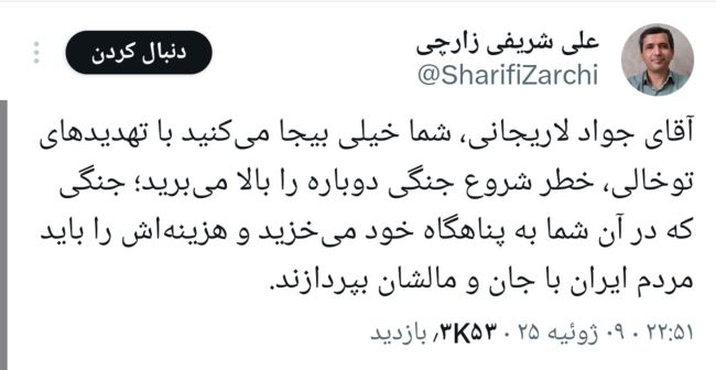علی شریفی زارچی با انتشار توئیتی نوشت: آقای جواد لاریجانی، شما خیلی بیجا میکنید با تهدیدهای توخالی، خطر شروع جنگی دوباره را بالا میبرید؛ جنگی که در آن شما به پناهگاه خود میخزید و هزینهاش را باید مردم ایران با جان و مالشان بپردازند.