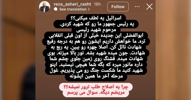 رضا عاشری، که در دور قبل انتخابات ریاست جمهوری در ایران معاون پشتیبانی ستاد سعید جلیلی درگیلان، رقیب آقای پزشکیان بود، چند روز پیش در اینستاگرام خود عکس مسعود پزشکیان را منتشر کرد و از اسرائیل «خواهش» کرد که «لطف» کند و آقای پزشکیان را مثل ابراهیم رئیسی که «شهید» کرده بود، «به درجه رفیع شهادت نائل» کند.