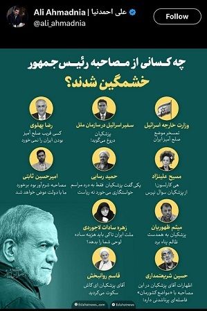 اولا:"اصلاحات نیوز" به عنوان رسانه 10 موضع علیه مصاحبه رییس جمهور را در کنار هم قرار داده و تنها نوشته "خشمگین" شدند و نسبت دیگری به آنها نداده است.
